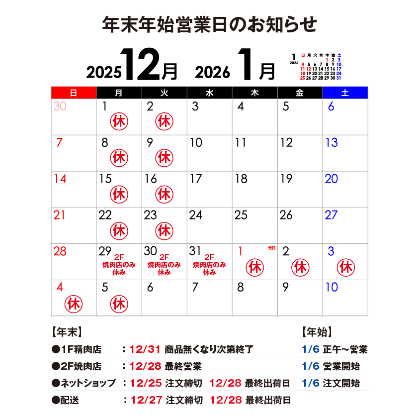 年末年始の営業は下記のとおりです。よろしくお願いいたします。